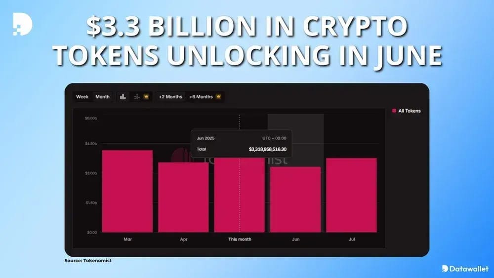 Roughly $3.3 billion worth of crypto tokens are set to unlock in June, according to data from Tokenomist. The amount represents a 32% decrease from May’s $4.9 billion and includes both cliff and linear unlocks. Projects typically lock tokens to prevent early dumps and reward contributors or investors over time.