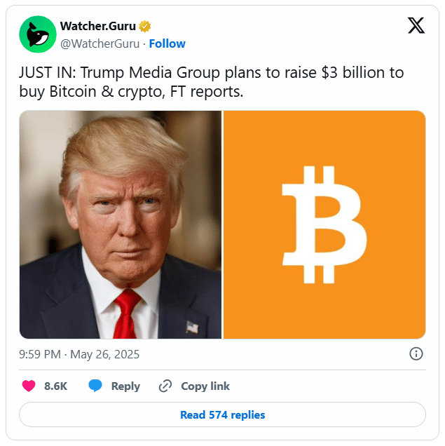 Trump Media & Technology Group is reportedly preparing to raise $3 billion for cryptocurrency investments, including a $2 billion equity round and $1 billion convertible bond. The capital raise, timed ahead of a crypto summit in Las Vegas, would mirror MicroStrategy’s leveraged BTC approach, according to six sources cited by the Financial Times.