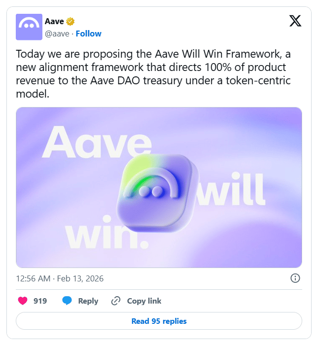 Aave Labs proposed a new framework to direct 100% of product revenue to the Aave DAO treasury. This strategic shift includes fees from swap protocols, the upcoming Aave Card, and future business lines like the planned AAVE ETF. The firm also suggested creating a separate foundation to house all trademarks and intellectual property for the multi-billion-dollar lending brand.