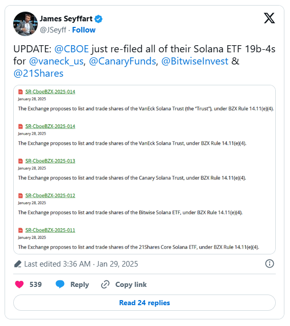 The Cboe BZX Exchange has refiled applications for Solana exchange-traded funds (ETFs) on behalf of Bitwise, VanEck, 21Shares, and Canary Capital. These applications were previously rejected by the SEC but have been resubmitted following a shift in regulatory leadership under the new crypto-friendly SEC chair, Mark Uyeda.