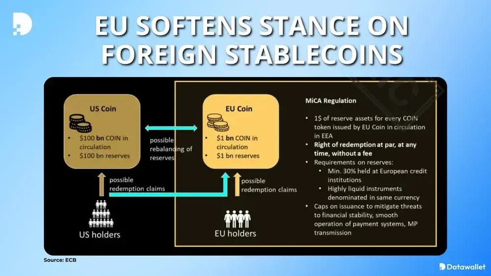 The European Commission has taken a more lenient stance toward jointly issued stablecoins from EU and non-EU entities. In contrast to ECB warnings about financial instability, the Commission said risks are manageable under the MiCA framework. It noted that redemptions would likely occur in jurisdictions like the US, where reserves are held.