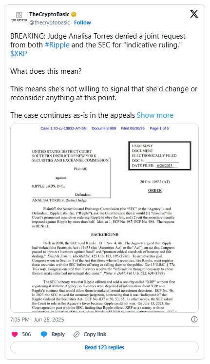 US District Judge Analisa Torres rejected a second attempt by the SEC and Ripple Labs to finalize a proposed $50 million settlement. The judge refused to dissolve a permanent injunction ordering Ripple to obey securities laws, citing a persistent risk of future violations. Torres emphasized that no “exceptional circumstances” justified modifying her original judgment.