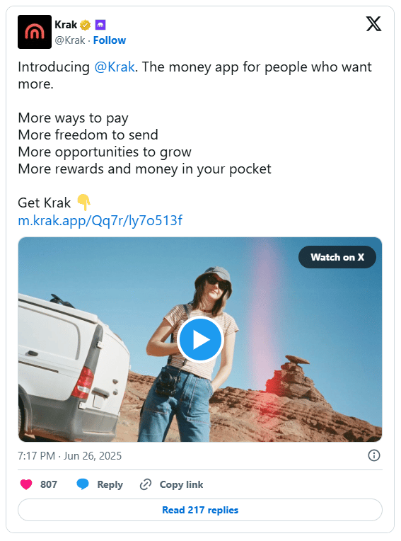 Crypto exchange Kraken has launched a new payments app called Krak, enabling users to send crypto and fiat to over 110 countries. The app supports more than 300 currencies and introduces user-specific Kraktags, allowing transfers without traditional bank accounts. Kraken said the app was designed to modernize payment rails and compete with firms like Cash App and PayPal.