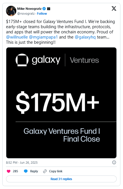 Galaxy Asset Management has closed its first external venture fund at $175 million, exceeding its $150 million target. The Galaxy Ventures Fund I will back roughly 30 startups building blockchain infrastructure, stablecoins, payments, and tokenization products. The firm said interest from institutions and family offices drove the fund’s oversubscription.