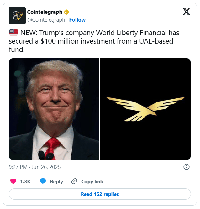 GM. Trump’s World Liberty just landed $100M from a UAE fund, marking its second major Gulf tie-up as the DeFi project eyes global expansion and prepares WLFI tokens for trading.