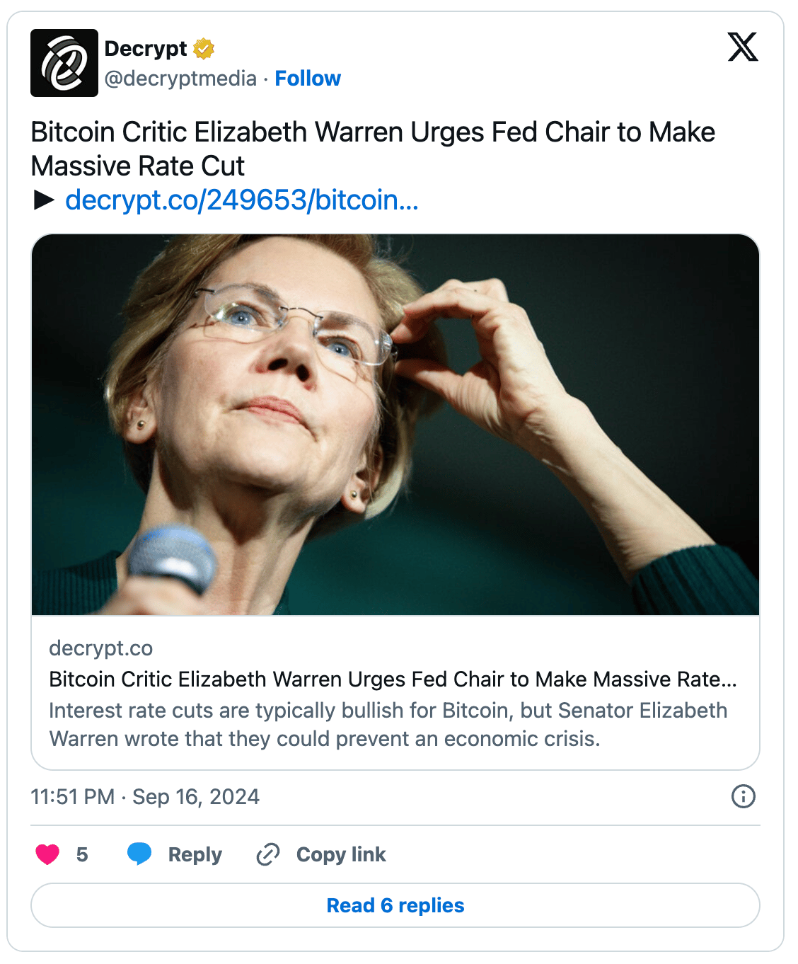 Known for her anti-Bitcoin stance, Warren has long viewed cryptocurrencies as a threat to the financial system, advocating for stricter regulations. Decentralized prediction markets like Polymarket expect a smaller 0.25% or 0.5% reduction. Despite rate cuts typically benefiting risk assets like Bitcoin, Warren's opposition to the crypto industry is set aside when it comes down to the "common good".