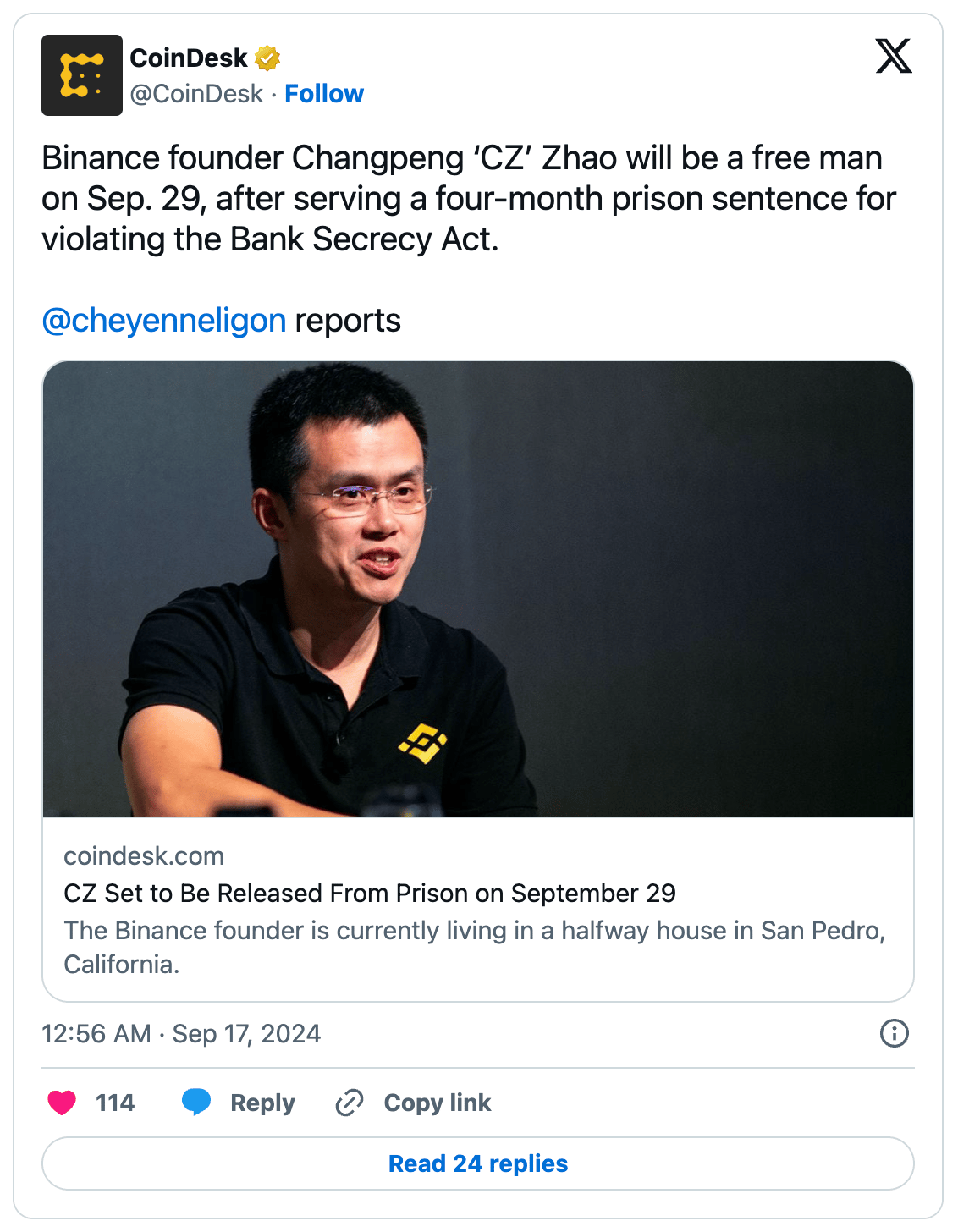 Binance founder Changpeng “CZ” Zhao will be released from custody on September 29 after serving a four-month sentence for violating the Bank Secrecy Act. CZ was moved to a halfway house in San Pedro, California, after serving three months at Lompoc II, a low-security prison, as part of his plea agreement, which included a $50 million fine.