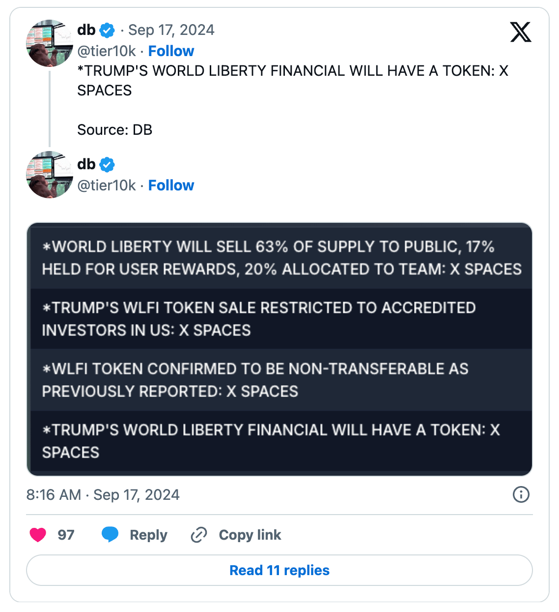 Donald Trump and his sons officially launched their crypto project, World Liberty Financial (WLFI), with 63% of the token supply set to be sold to accredited US investors under SEC regulations (>$200k gross income). The WLFI token, designed for governance and non-transferability, will power a borrowing and lending service on Ethereum, aiming for accessibility beyond traditional DeFi protocols.