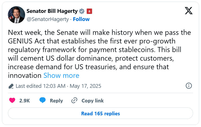 The US Senate will hold a second vote Monday on the GENIUS Act, after the stablecoin bill failed to advance earlier this month. Senator Bill Hagerty said the chamber is “set to make history,” with bipartisan sponsors confident the revised language can win enough support.