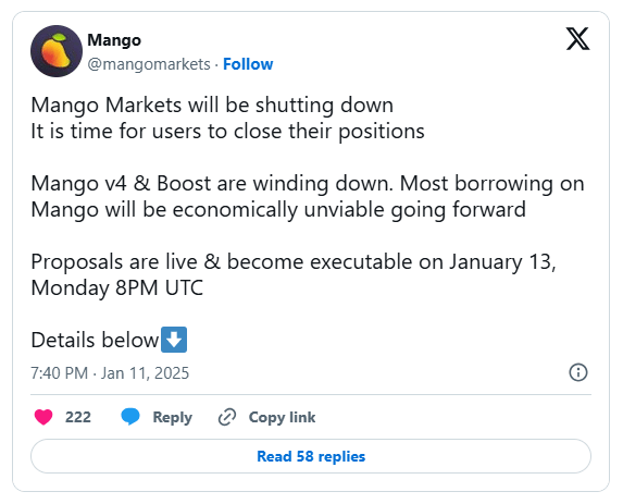 Solana decentralized exchange Mango Markets announced it will cease operations, urging users to close positions by Jan. 13. This follows governance votes to end borrowing and lending on the platform, alongside a $700,000 settlement with the SEC over unregistered securities sales.