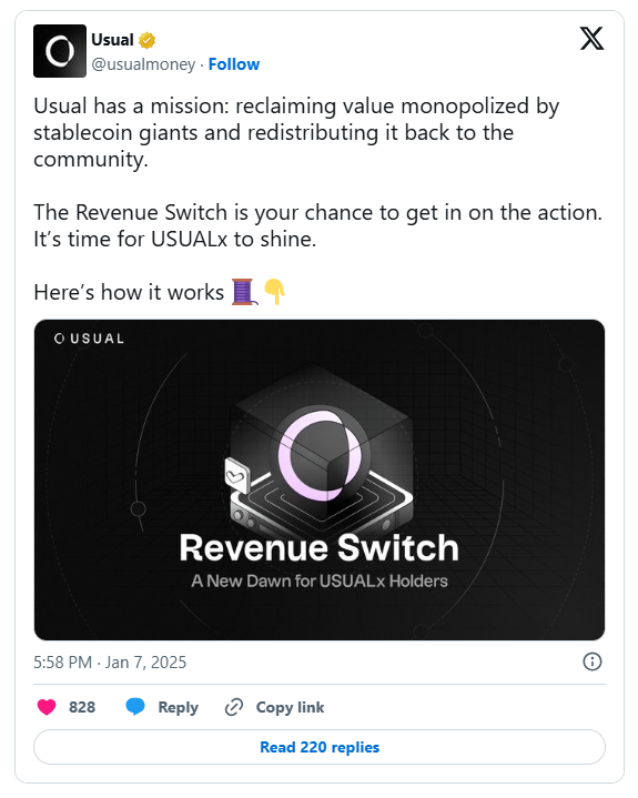 Usual Protocol, a stablecoin issuer, announced the activation of a “revenue switch” model following USD0++'s depegging on January 9, when it fell as low as $0.89, sparking multimillion-dollar liquidations and widespread backlash from the DeFi community.