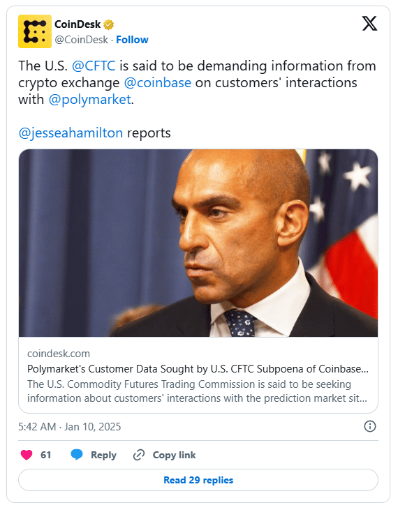 The U.S. Commodity Futures Trading Commission (CFTC) has subpoenaed Coinbase for data on customer interactions with prediction market Polymarket, according to a source familiar with the situation. Coinbase informed affected users about the regulatory request, stating it reviews all government inquiries for legal sufficiency.