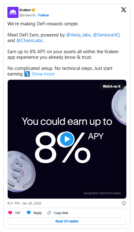 Crypto exchange Kraken rolled out a new DeFi Earn product this Monday for users in the US, EU, and Canada. The service offers annualized returns of up to 8% by connecting centralized accounts to decentralized liquidity vaults powered by Veda. Risk managers Chaos Labs and Sentora currently oversee the first three USDC vaults to ensure institutional-grade security for participants.