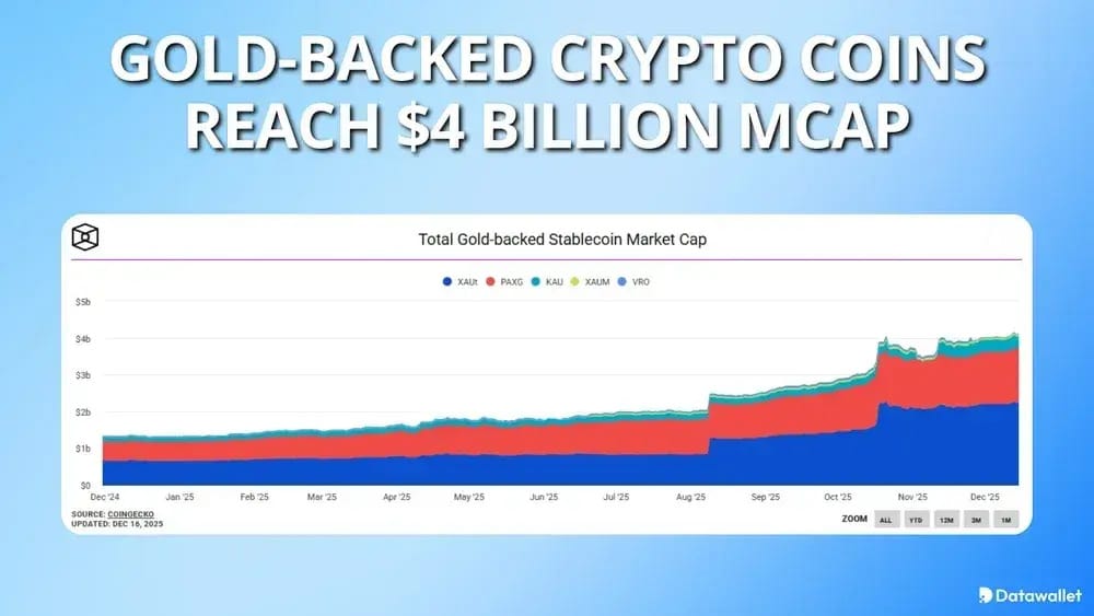 Gold-backed stablecoins surpassed $4 billion market capitalization in 2025, nearly tripling from $1.3 billion earlier. The growth reflects rising gold prices and increased investor demand for tokenized safe-haven assets. Gold prices rose approximately 66% year-to-date amid geopolitical risks and persistent macroeconomic uncertainty.