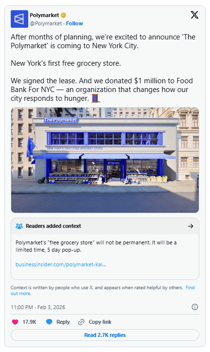 Polymarket responded by announcing plans to open a permanent free grocery store in New York starting next Thursday. The platform also donated $1 million to the Food Bank for NYC to support local residents with limited access to affordable nutrition. Both firms are utilizing these high-impact physical marketing campaigns to establish brand authority in the global financial capital this February.