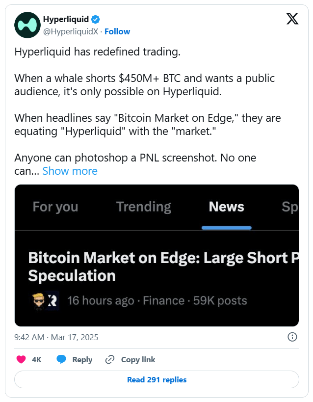 Despite the market pressure, the whale continues to add collateral, keeping the position open. Hyperliquid’s official account acknowledged the event, stating, “When a whale shorts $450M+ BTC and wants a public audience, it’s only possible on Hyperliquid.”