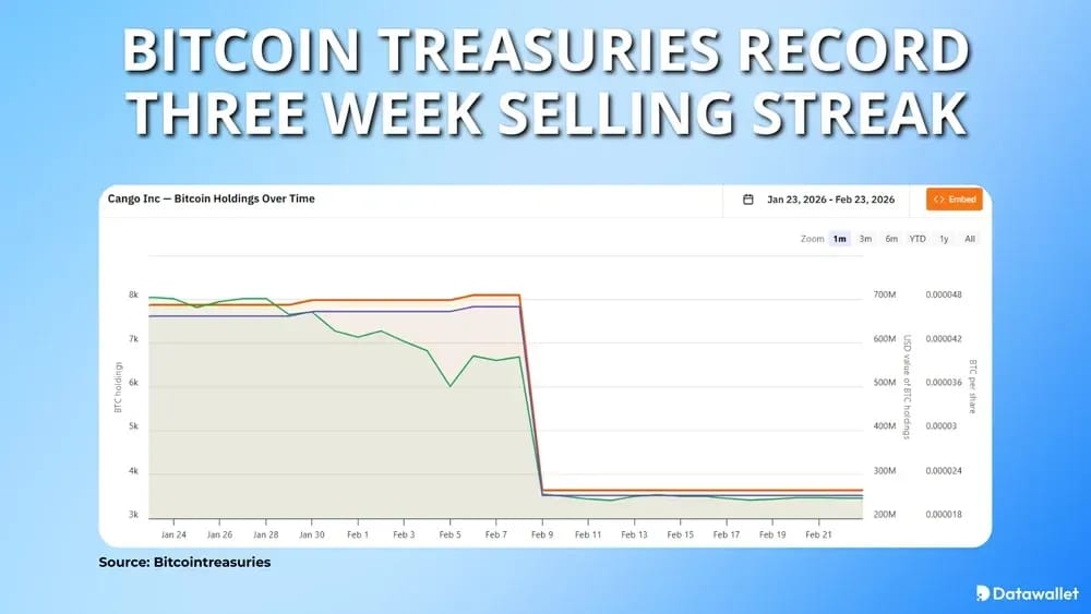 Corporate Bitcoin treasury companies logged a rare three-week selling streak as Bitcoin prices struggled to maintain the $66,000 level. Analysts noted that this unprecedented shift among public companies could push the market toward new local lows. While the largest holders remain steady, smaller firms like Cango Inc. reduced their exposure by over 54% this month.