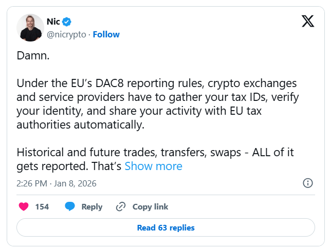 The new DAC8 crypto tax reporting regime officially launched across the European Union on January 1. This mandate requires centralized exchanges to share customer identities and transaction histories with national financial authorities annually. Many blockchain community members argue that these aggressive transparency rules signal the end of financial anonymity for European residents.